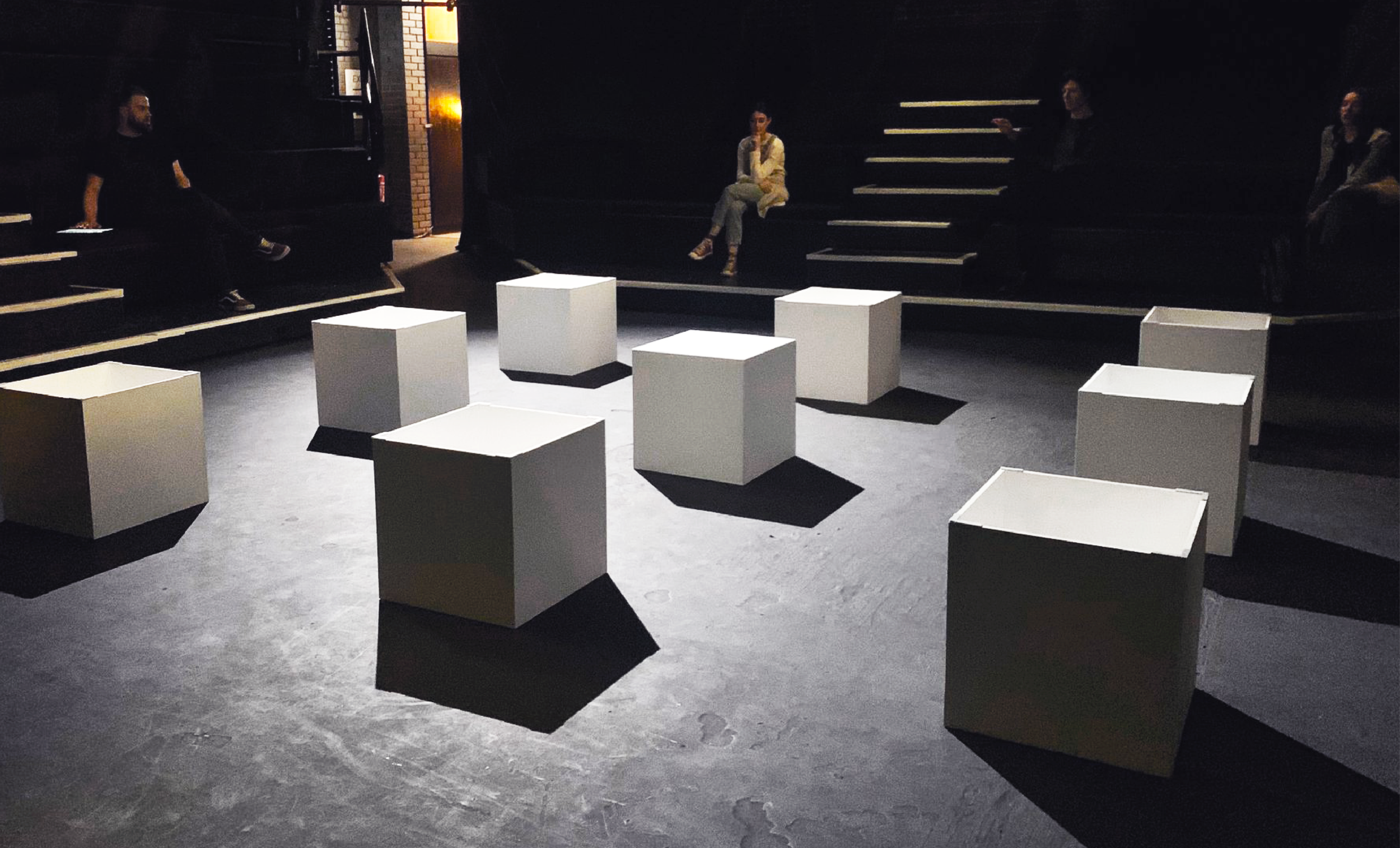 As the scenes played out, the characters would seamlessly bring on and interact with additional cubes. These would make up tables, New York cabs, moving boxes and shop fronts. As stories were told, these cubes would then be added to the canvas.